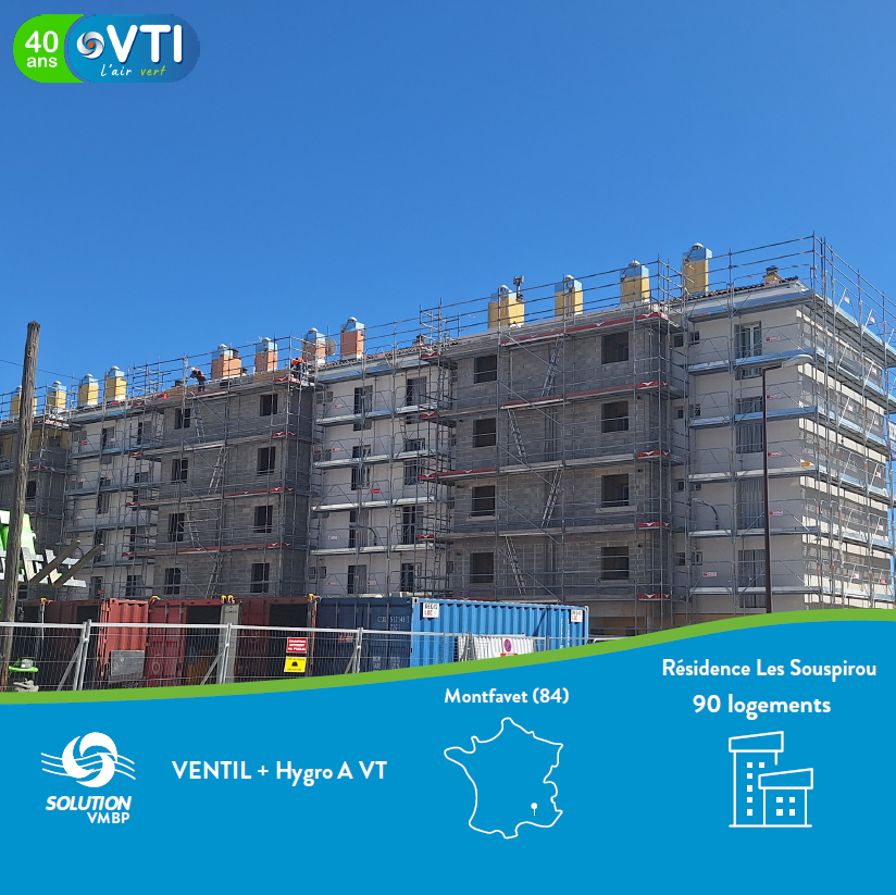 Aujourd’hui, Direction Montfavet (84) pour découvrir le projet « Résidence Les Souspirou » mené par notre client installateur GTI PROVENCE, assisté par l’entreprise générale BOUYGUES BATIMENT SUD EST ainsi que le maître d’œuvre ATELIER GLEYZE et en réponse aux besoins du maître d’ouvrage GRAND DELTA HABITAT. Nous avons ainsi accompagné GTI PROVENCE pour le déploiement de la solution de ventilation mécanique basse pression Ventil + Hygro A, qui équipe désormais les 90 logements de la résidence répartis sur 4 bâtiments.